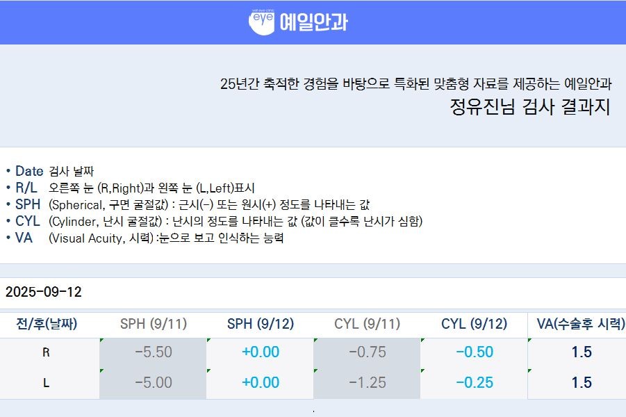 렌즈와 안경없이도 앞이 잘 보이고 진료 전 검사에서도 1.5의 시력이 나왔다는 소식을 듣고 너무 좋더라구요..